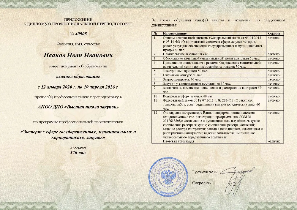Вы получаете диплом эксперта о профессиональной переподготовке. Высшая школа закупок (fz44.org) в обязательном порядке вносит сведения об обучении в Белгороде в реестр Рособрнадзора, подтверждая вашу квалификацию для работы в ведомствах и госкорпорациях Белгорода.