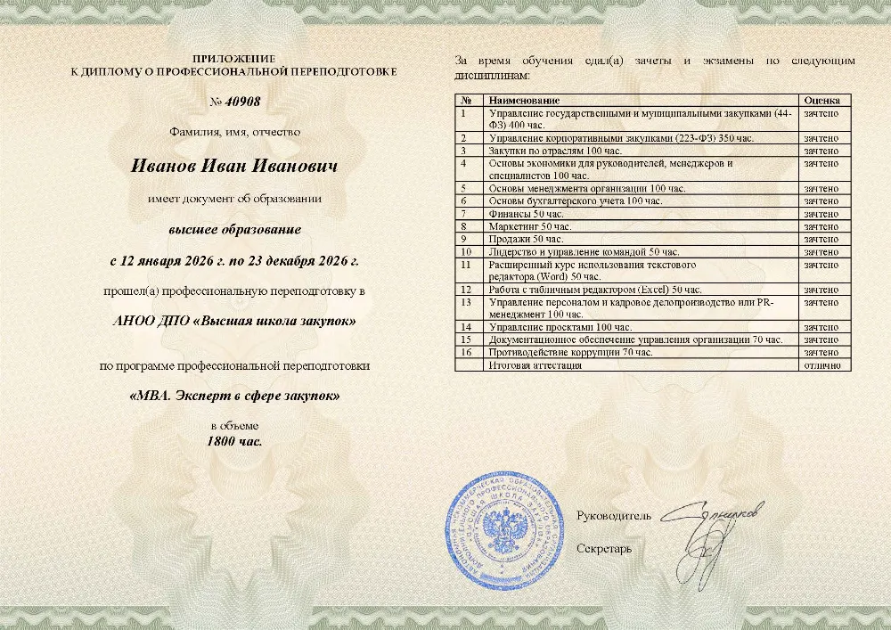 Вы получаете престижный диплом о профессиональной переподготовке с присвоением квалификации эксперта (MBA). Высшая школа закупок (fz44.org) в обязательном порядке вносит сведения об обучении в Белгороде в реестр Рособрнадзора, подтверждая ваш высший квалификационный статус.